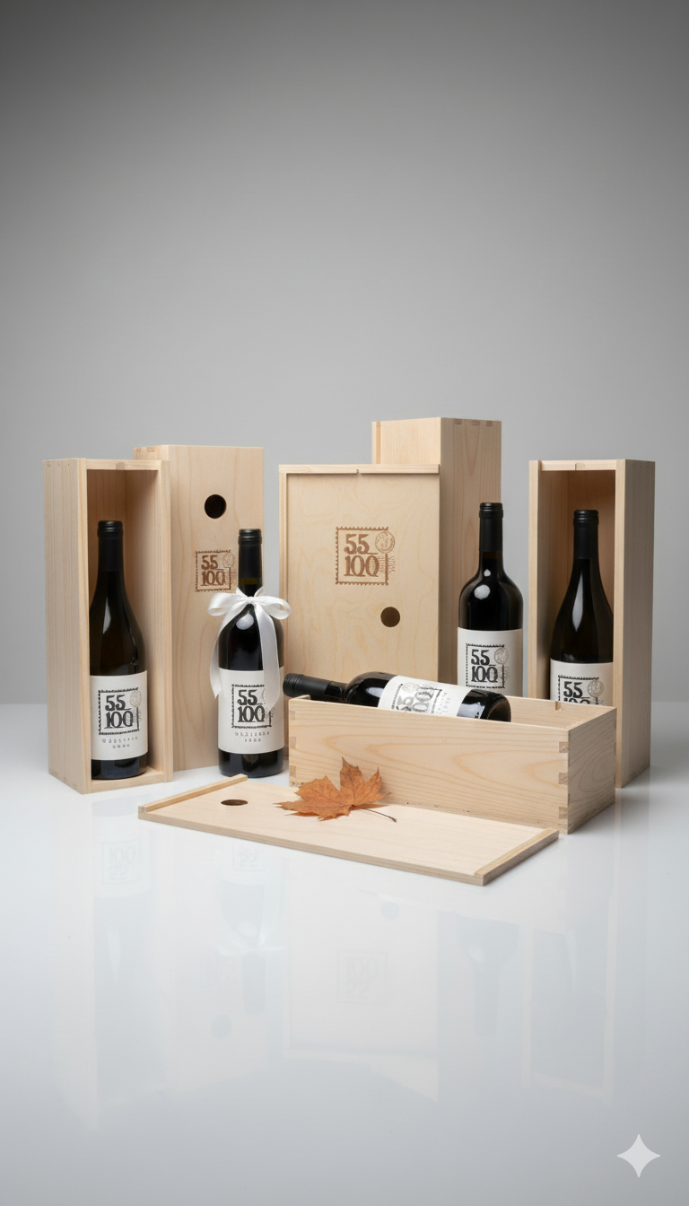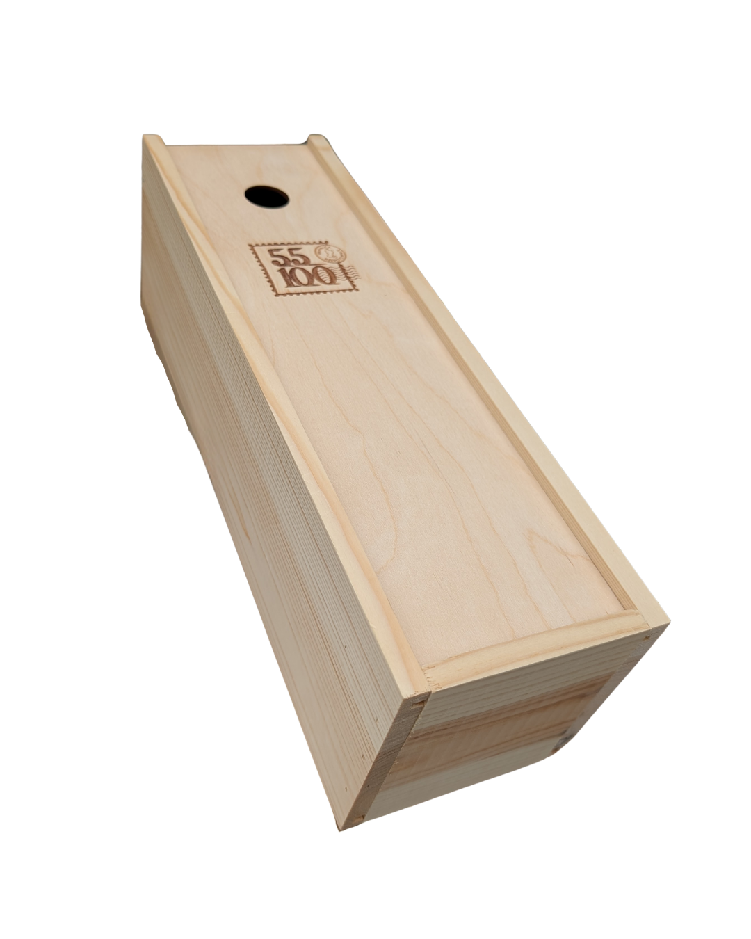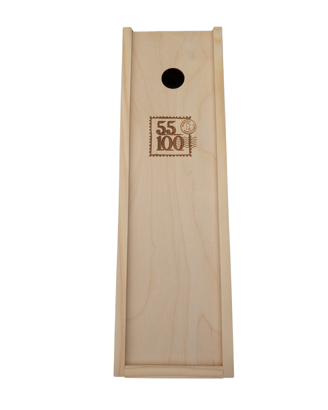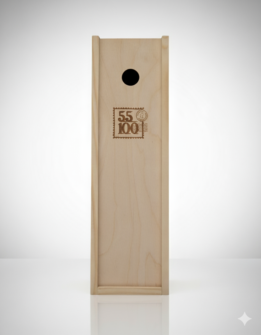Drewniana skrzynka na jedną butelkę wina z wełną drzewną, która daje ładny efekt dekoracyjny. Na zasuwie skrzynki logotyp Winnicy 55-100. Okrągły otwór na palec ułatwia otwarcie skrzynki, ale również sprawia że może być ona wykorzystana jako korkołap - czyli pojemnik do kolekcjonowania korków po winach.